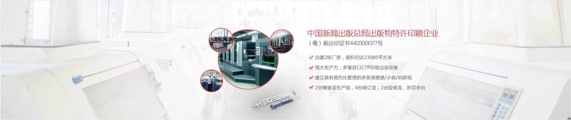 公司實(shí)力雄厚,設(shè)備先進(jìn)。 聚集了許多高等院校的尖端高級(jí)印刷專業(yè)人才,擁有國(guó)際頂尖的、全球最大的成套印刷設(shè)備— - 德國(guó)海德堡-對(duì)開四色、五色、雙色、單色、四開四色機(jī)等的主體印刷設(shè)備, 擁有高水準(zhǔn)后道加工系統(tǒng)—— 全電腦控制的斯塔爾折頁(yè)機(jī)、 STAHL 自動(dòng)折頁(yè)機(jī)、 全自動(dòng)鎖線機(jī)、 全自動(dòng)騎馬訂聯(lián)動(dòng)機(jī)、馬天尼膠裝龍、 程控切紙機(jī)、環(huán)保型過膠機(jī)、啤機(jī)等 精良裝備,整套印前印后設(shè)備。